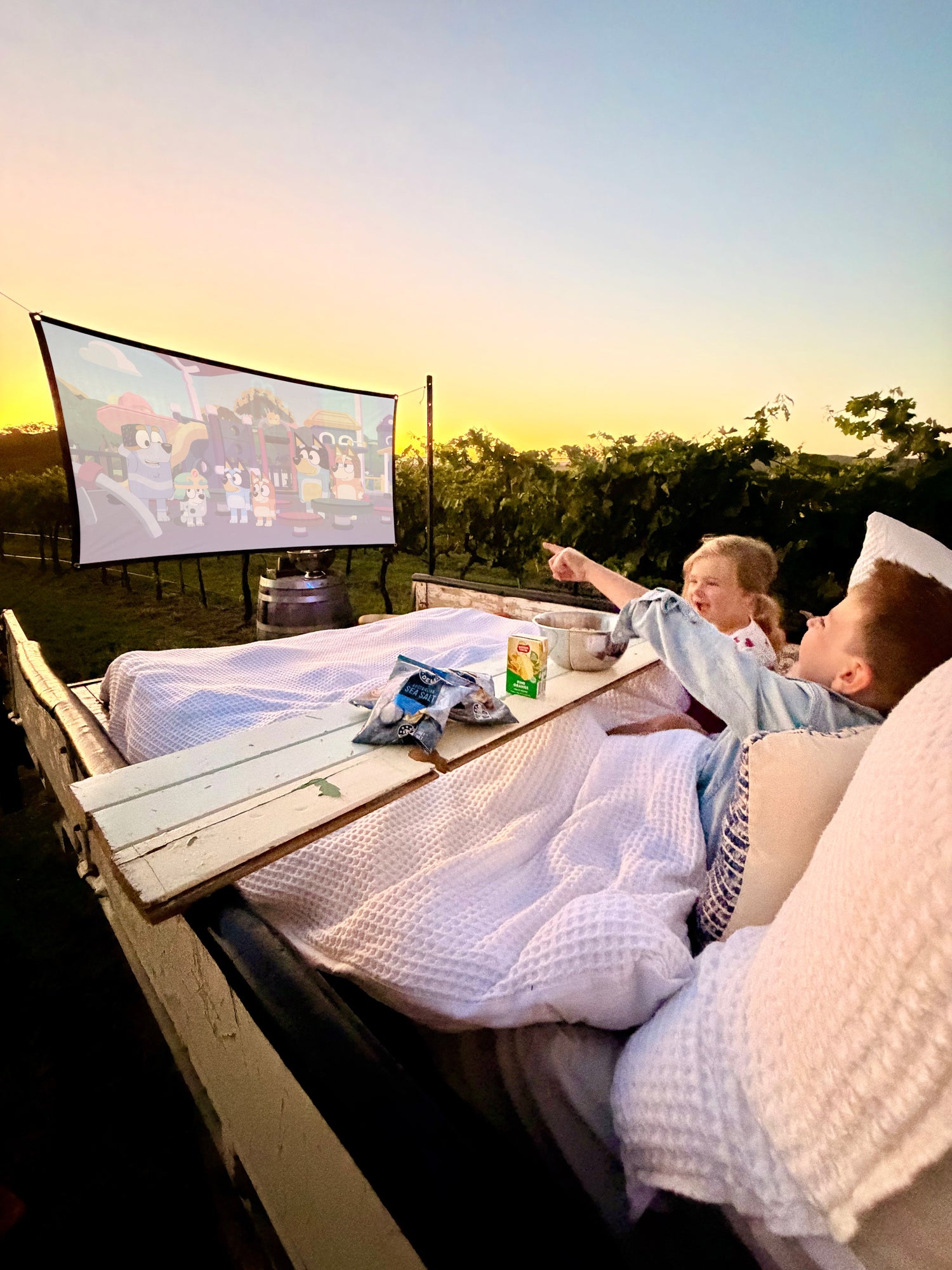 Settle into your own private vineyard cinema as the sun sets over the Dear Vincent vines. We have transformed the back of our old Landcruiser ute into the most comfortable cinema seat you will ever sink into. Think queen mattress, soft pillows, blankets, lanterns and uninterrupted views across the vineyard out to the national park.